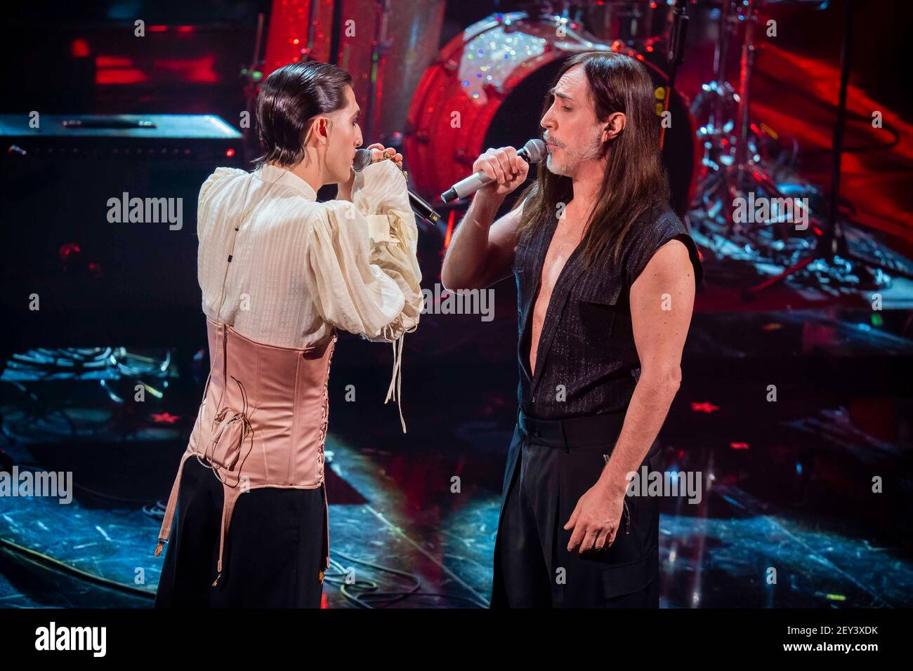 Damiano David Of Maneskin And Manuel Agnelli At The Third Evening Of The 71 Sanremo Music Festival Sanremo Italy March 4th 2021 Photo By Marco Piraccini Mondadori Portfolio Sipa Usa Stock Photo Alamy